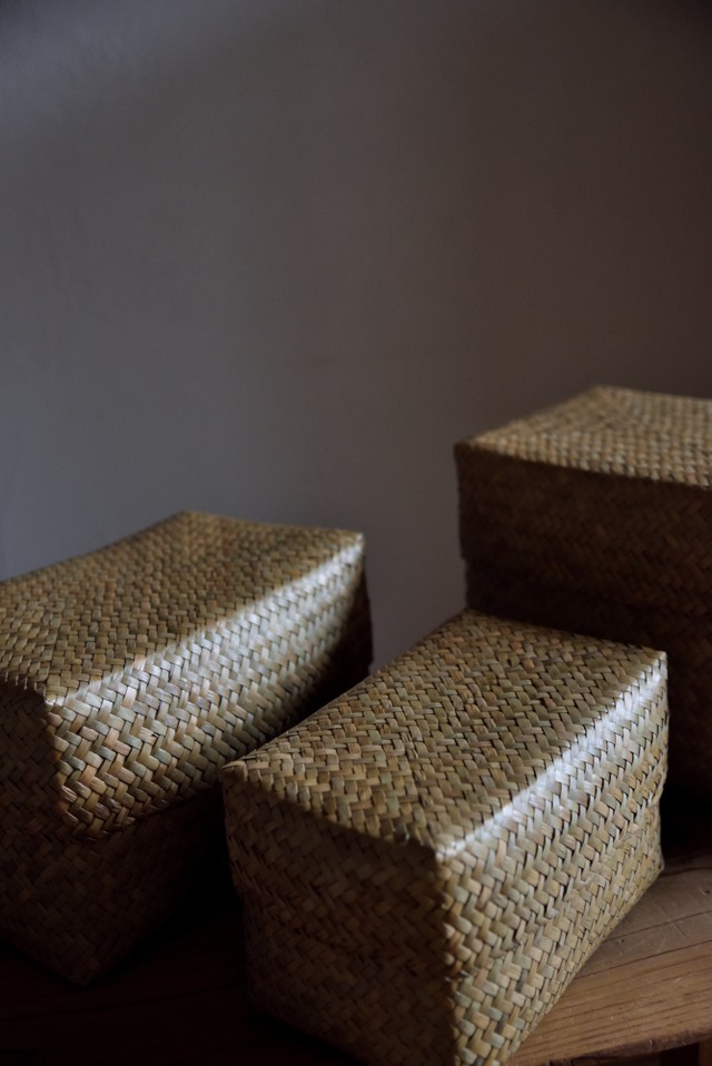 柔軟性のある水草(カチュー)を格子状に編んだふた付きBOX。 しっかりと隠してくれるのでふた付きはとても便利です。 インテリアに馴染みやすいので、見せる収納として。 Lサイズ 長さ31cm 幅19cm 高さ20cm 自然素材の手編み製品ですので、それぞれ微妙な風合いやサイズの前後がございます。ご了承の上お求めください。 科学原材料製品のような耐久性とは異なりますので、重い物を入れすぎないよう、天然素材相応の荷重でのご利用をお願い致します。 〈 お手入れ方法 〉 ホコリやゴミなどは柔らかいブラシで優しく掃除してください。汚れが目立つ際には固く絞った濡れた布で拭き、湿気がのこらないよう自然乾燥させてください。