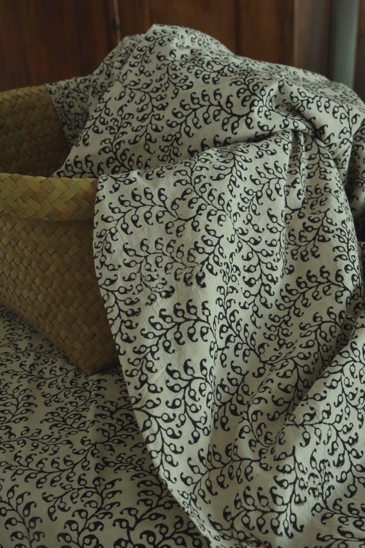 木製ブロックを使用して、天然染料で模様を布にプリントする、インドのラジャスタン州にあるバグルー村で受け継がれている伝統的な染色技法です