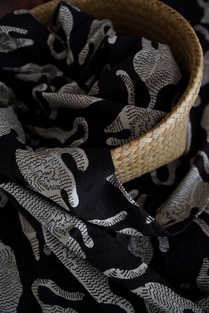 木製ブロックを使用して、天然染料で模様を布にプリントする、インドのラジャスタン州にあるバグルー村で受け継がれている伝統的な染色技法です