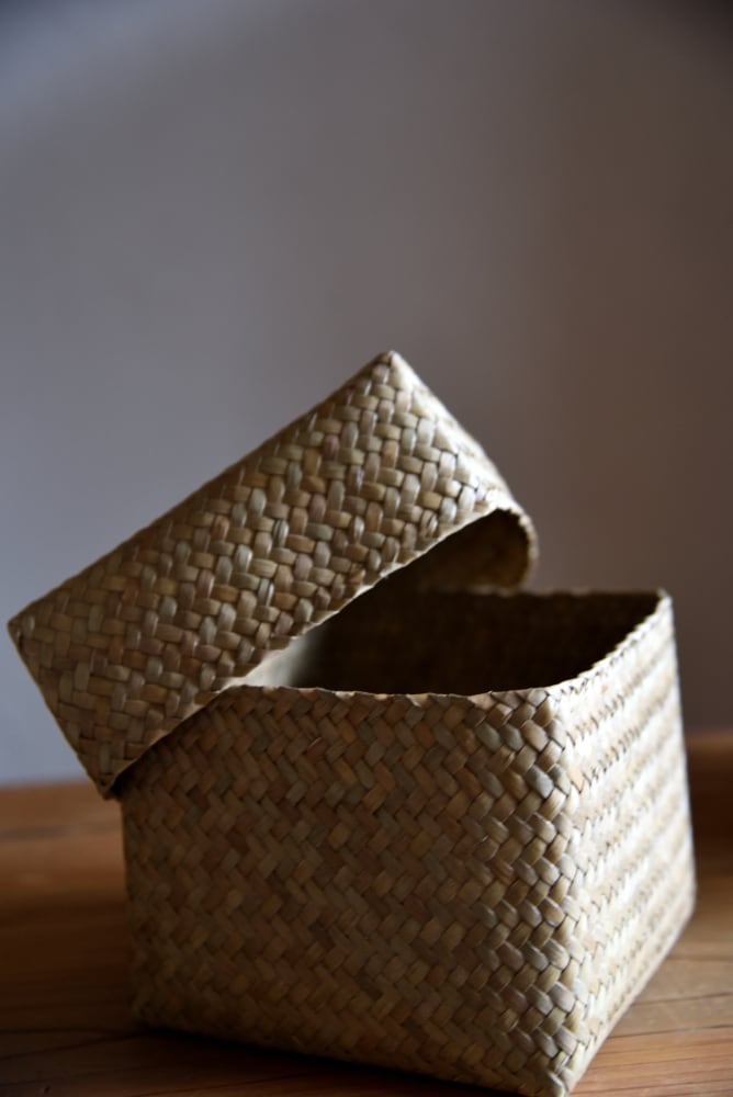 柔軟性のある水草(カチュー)を格子状に編んだふた付きBOX。
