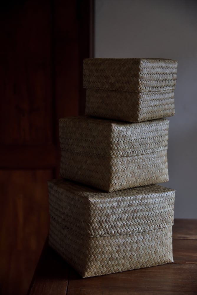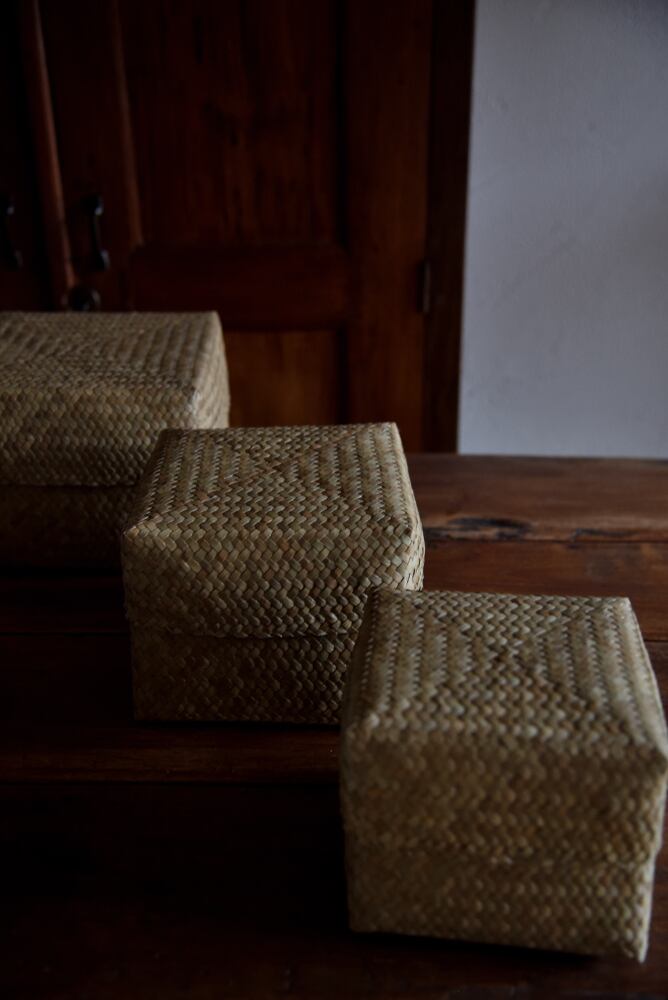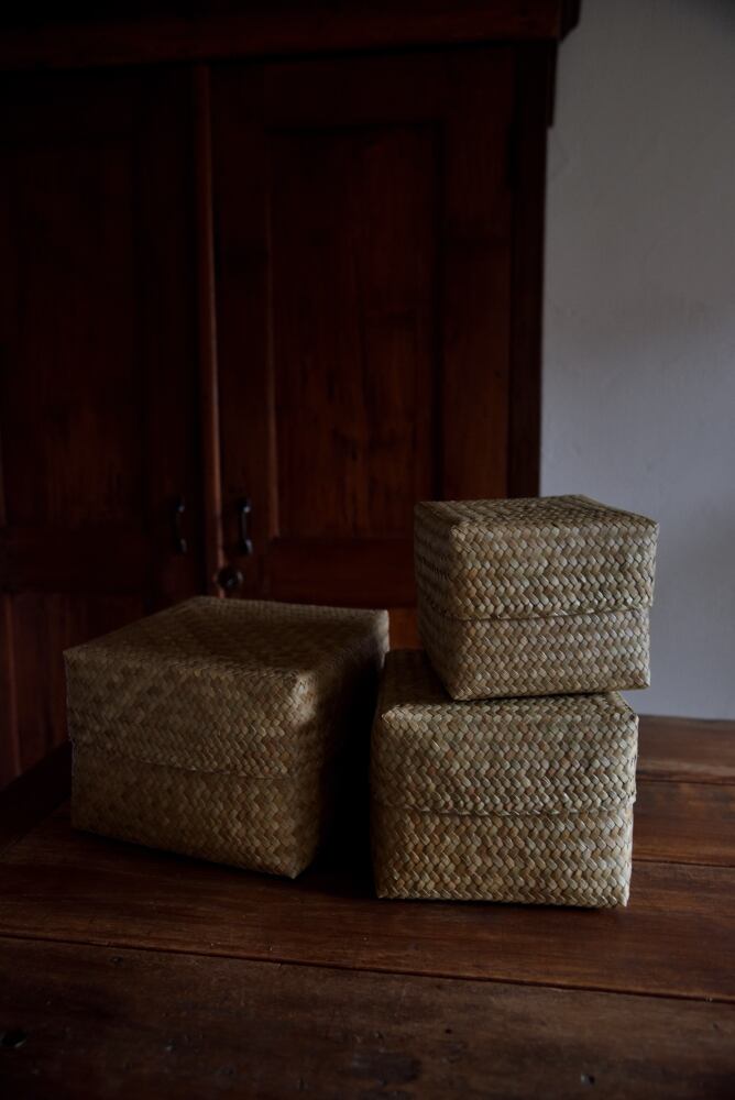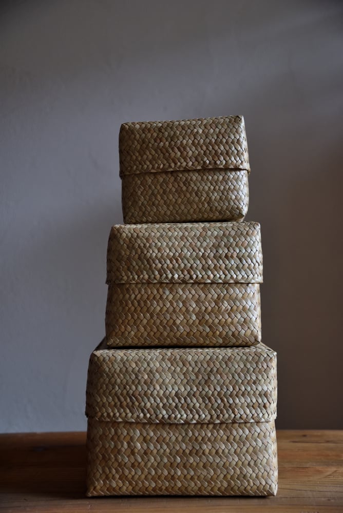 柔軟性のある水草(カチュー)を格子状に編んだふた付きBOX。