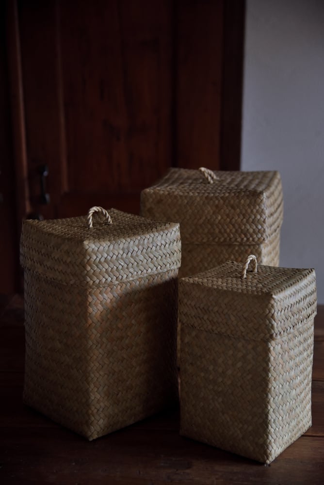 柔軟性のある水草(カチュー)を格子状に編んだ取っ手付きBOX。