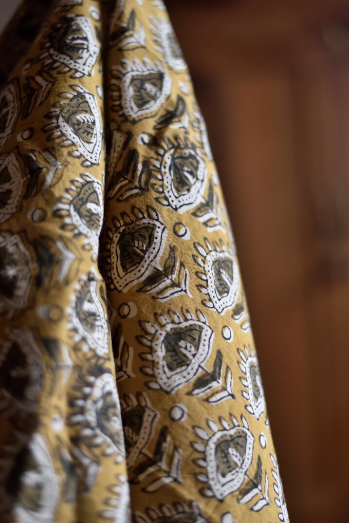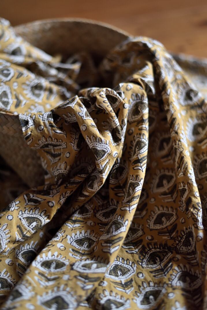木製ブロックを使用して、天然染料で模様を布にプリントする、インドのラジャスタン州にあるバグルー村で受け継がれている伝統的な染色技法です