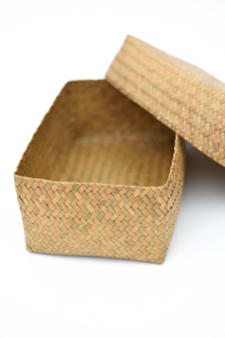 柔軟性のある水草(カチュー)を格子状に編んだふた付きBOX。