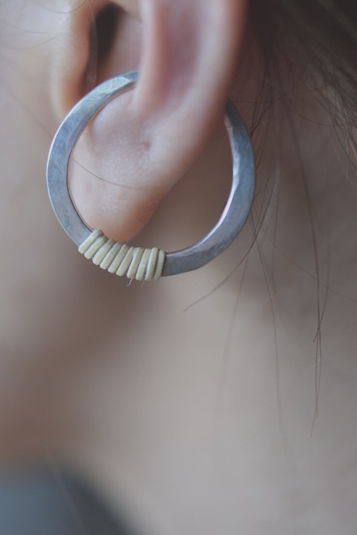 シルバーの冷たさが藤によって和らげられ、肌にすっと馴染みます。普段シルバーをつけなれない方でも取り入れやすいデザインです。