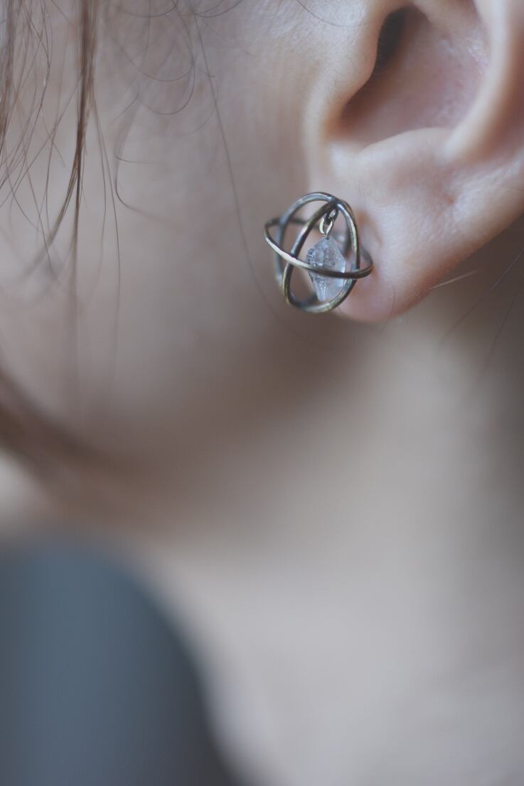 存在感のある真鍮格子の中で可憐な水晶がゆらゆらと動きます。真鍮と水晶の相性が、甘くも強くもなりすぎない絶妙なバランスです。