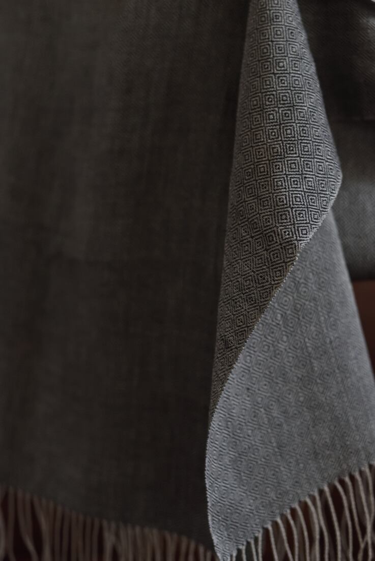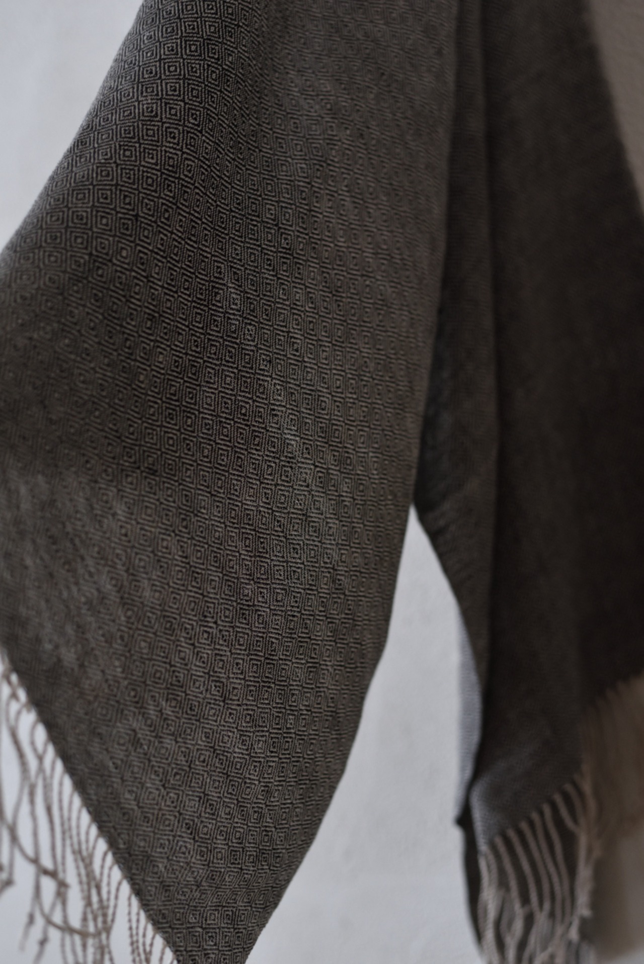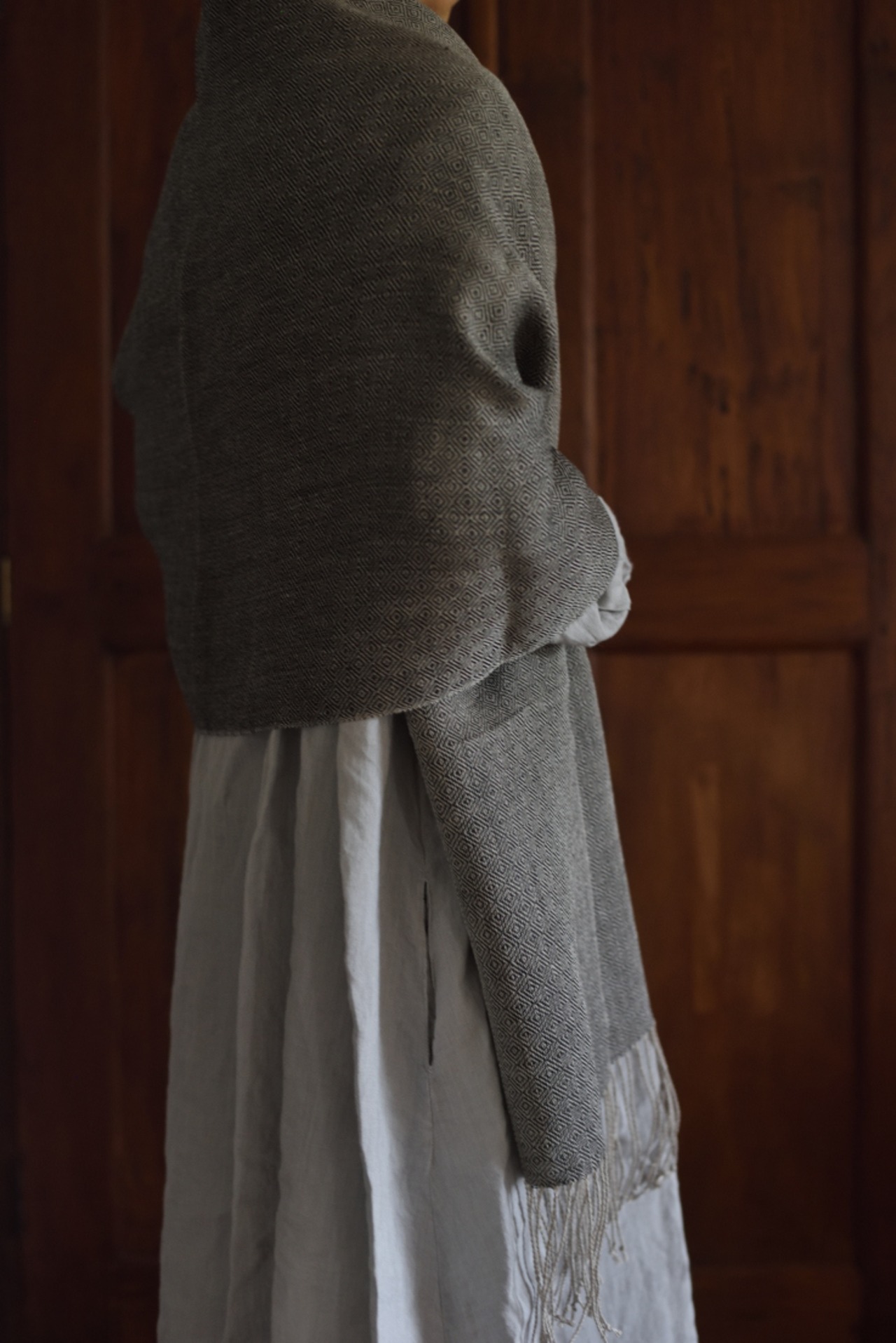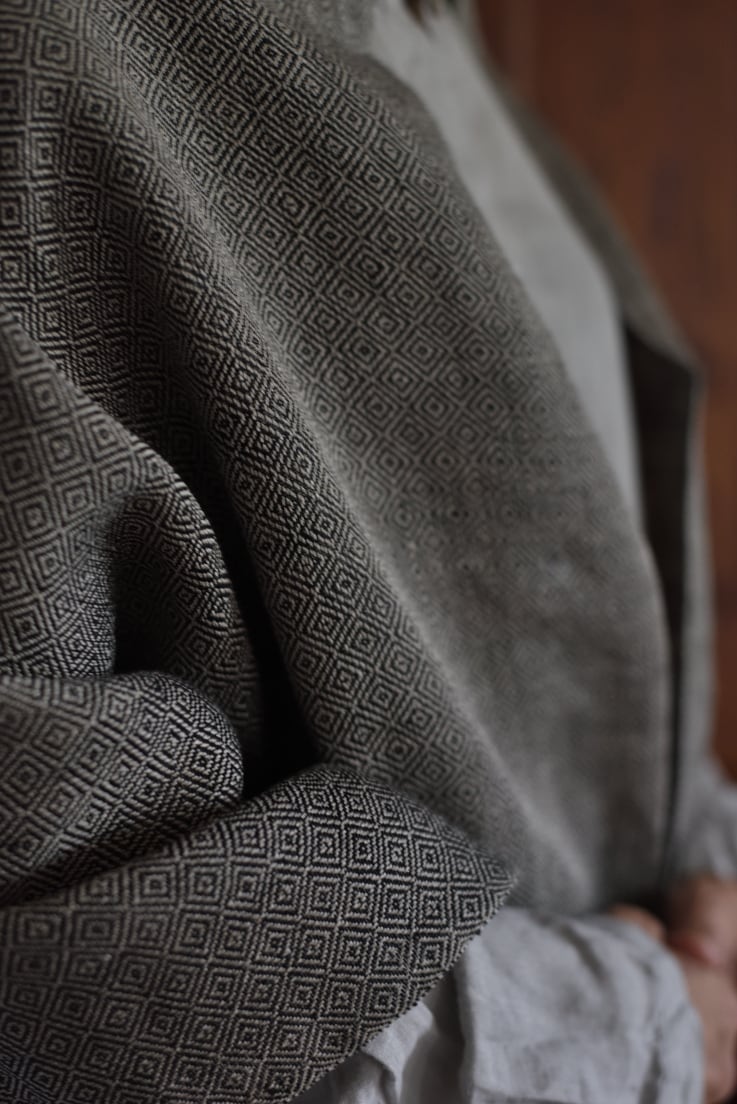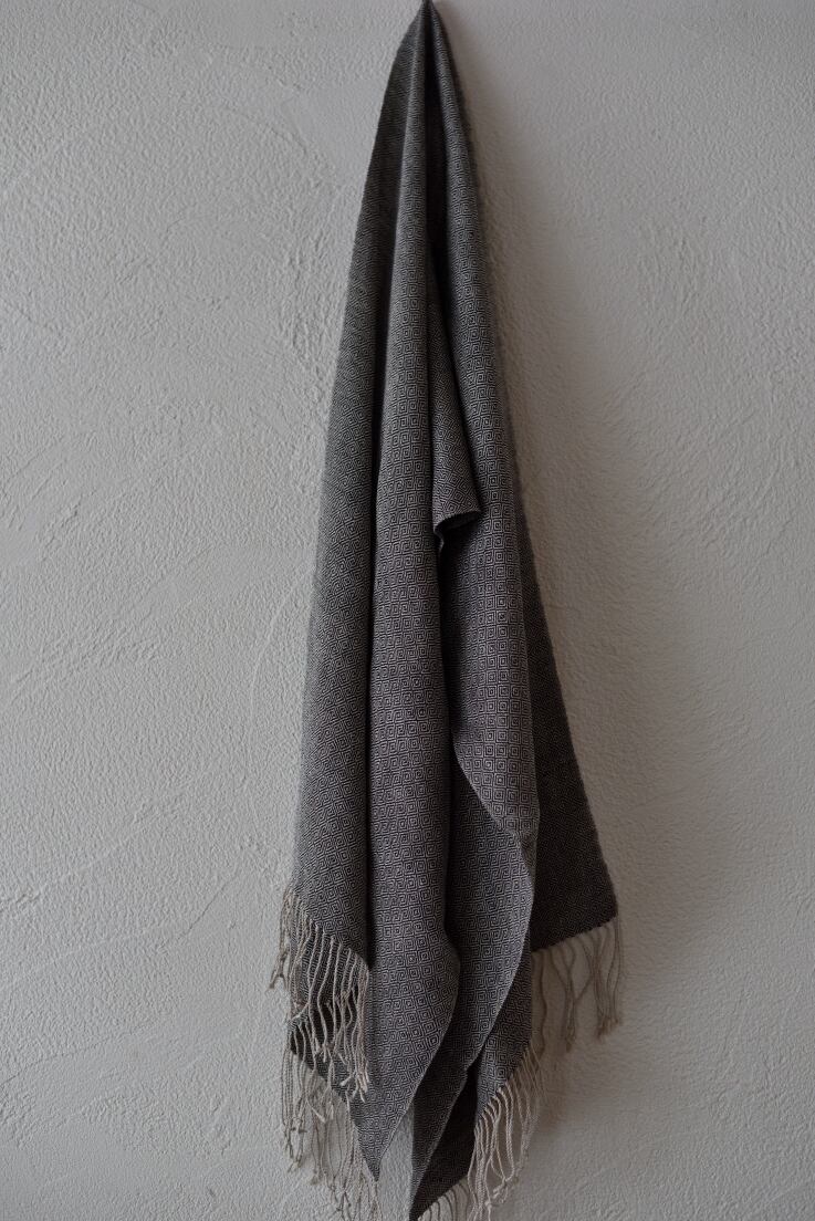 フランス産原料を使用した、国産リネン糸で織りあげたKoriolis Textilesの手織りのストール。小さなグーズアイ柄がリネンの光沢を引き立て、とても美しい作品です。